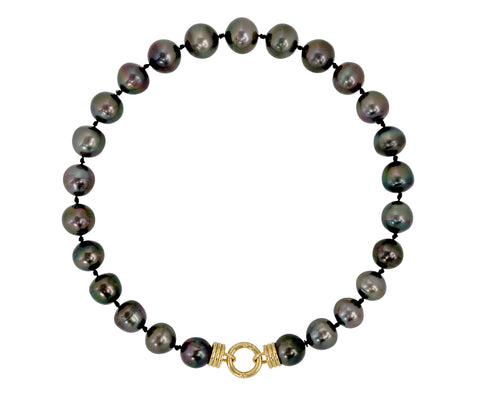 With its large scale and earthy design, this Beck necklace has a statement-making sophistication. Each luminescent, gray Tahitian pearl is strung along black silk and capped on either end by her signature 18K yellow gold tubes. The pearl strand closes with an 18K yellow gold push clasp where you can also add any of your favorite pendants.