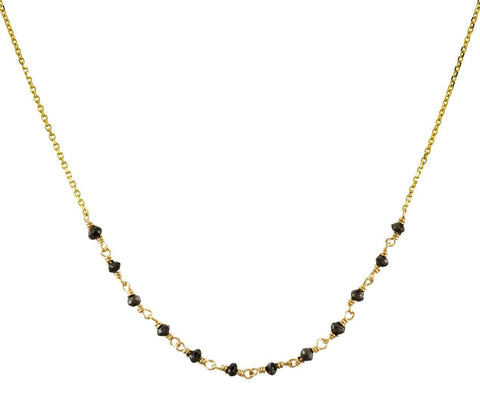 This Jennie Kwon necklace adds a mesmerizing sparkle to any look. The center segment of the 14K gold chain shimmers with tiny, faceted black diamond beads wrapped in the 14K gold to create little links. Alone or added to a layered look, the necklace possesses a stunning, understated elegance and modern minimalism.