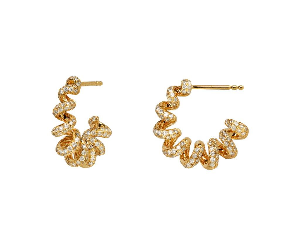 With their playful vibe and modern design, these Boochier hoops are a larger take on her smaller diamond slinkee hoops. The polished 18K yellow gold slinkee design tapers in size and sits close to the ear. They are covered in round, white diamonds and connect to 18K yellow gold post backs. They have the perfect amount of weight and style to wear every single day.