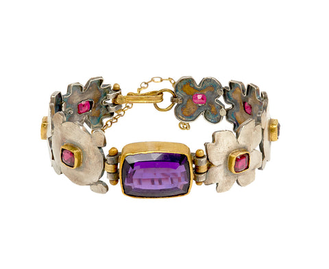 Captivating in its eye-catching color and striking composition, this one-of-a-kind Judy Geib bracelet has a style-defining design. The rectangular amethyst is framed in a band of 22K yellow gold. It is set at the center of two segments of sterling silver shapes which are each set with a red spinel at their center and closes with an 18K yellow gold safety clasp.