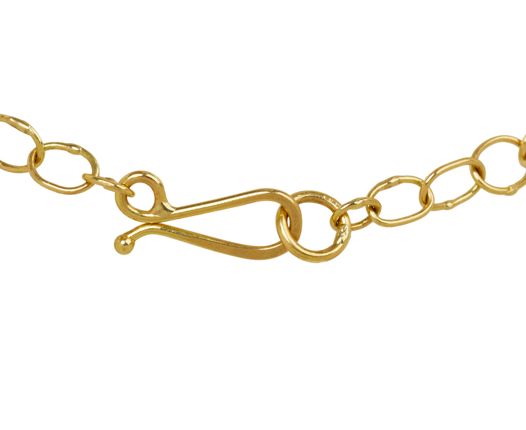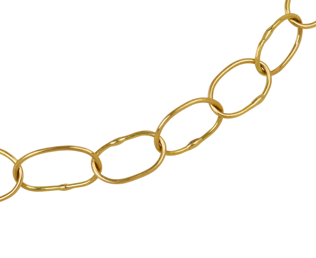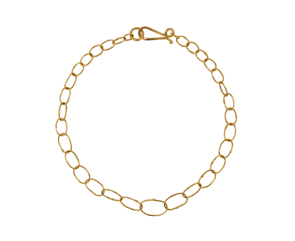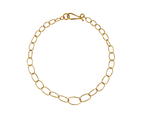 This modern, minimal Sarah McGuire bracelet is perfect for layering. The strand is composed of subtly graduating circular and oval handmade links of 18K yellow gold. A classic jewelry collection staple.