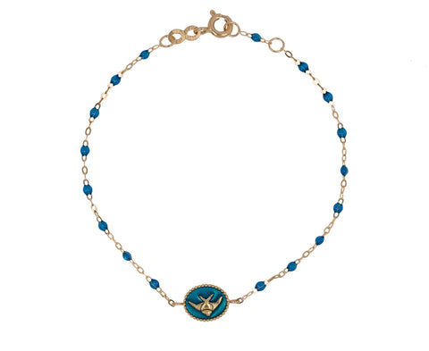 With its playful, striking design and dark color, this Gigi Clozeau bracelet also adds a hint of sparkle to your bracelet stack. The 18K yellow gold and sapphire blue enamel charm is set with a 18K yellow gold starfish. It sits at the center of the 18K yellow gold and blue sapphire resin beaded bracelet.