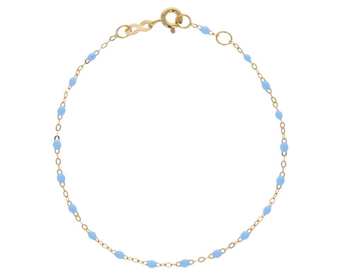 Captivating in its subtle sparkle and cool toned color palette, this Gigi Clozeau bracelet exudes a quiet luxury. Set along the 18K yellow gold chain are tiny drops of pale blue resin. Alone or layered with your other favorites, it adds a modern, timeless feel to any collection.