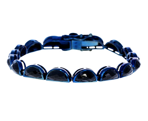 Bold and edgy, this Nak Armstrong bracelet is from his mosaic inspired Nakard Collection. Each semi circle of faceted black spinel is framed in a striking setting of blue rhodium plated sterling silver to create each link. It fastens with a safety clasp and looks amazing nestled in a layered stack of your other favorites.