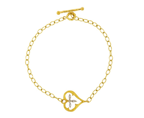 This lyrical charm bracelet symbolizes the universal sentiment of love with quiet elegance and easy-to-wear sophistication. The 22K yellow gold branch heart encloses a sparkling diamond and platinum three petal blossom and is connected to the center of the 22K gold tiny lacy chain bracelet. Alone it exudes a restrained, feminine luxury, but add it to a multi-bracelet collection for lovely sparkle. A stunning alternative to the traditional gold heart charm bracelet.