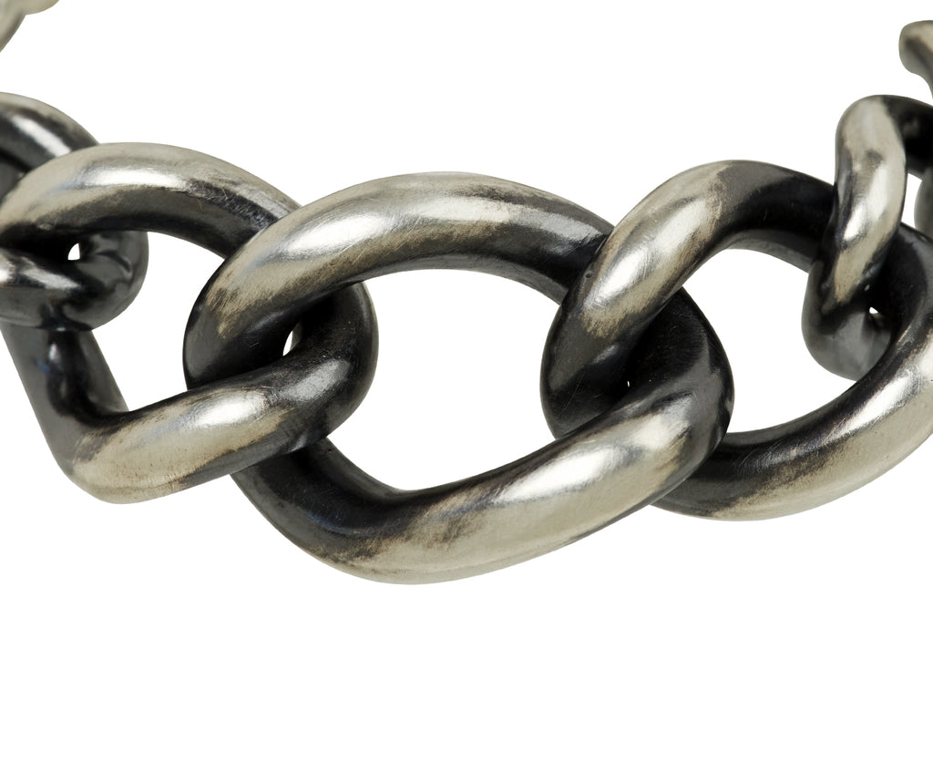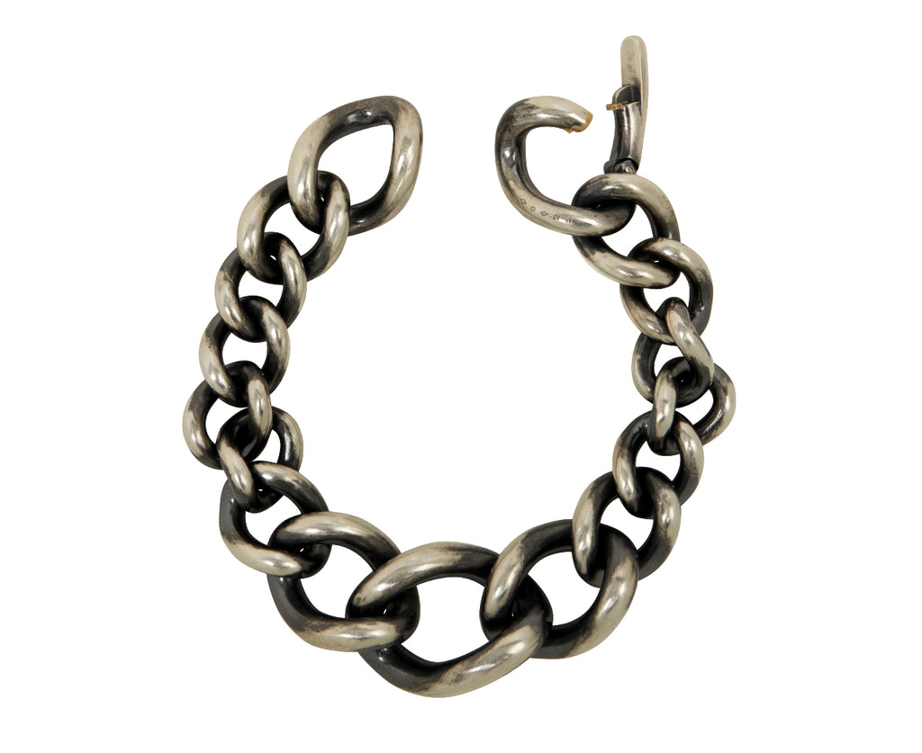 Breathtaking in its weighty feel and perfectly rendered details, this hum bracelet is perfect whether worn alone or layered with your other favorites. The heavy, tapered blackened sterling silver chain links connect to one another to create the heavy strand. It closes with their signature sterling silver pull clasp closure.