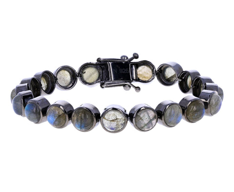 Bold, edgy and inspired by the architectural geometry of mosaics, this Nak Armstrong bracelet is from his Nakard Collection. Smooth cabochons of subtly iridescent labradorite are framed in contrasting settings of black rhodium plated sterling silver to create each link. The bracelet fastens with a safety clasp and looks amazing alone or nestled in with your other casual favorites.