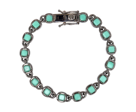 Bold, edgy and inspired by the architectural geometry of mosaics, this Nak Armstrong bracelet is from his Nakard Collection. Princess cut, spring green chrysoprase are framed in contrasting settings of black rhodium plated sterling silver to create each link. The bracelet fastens with a safety clasp and looks amazing alone or nestled in with your other casual favorites.