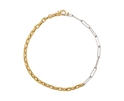 Striking and effortless, this Milamore bracelet is an interesting alternative to the classic chain bracelet. The two chains of 18K yellow gold and white gold are the perfect combination of gauge chain and gauge wire. Finished with an 18K yellow gold lobster clasp closure set with diamonds. This is a classic bracelet to layer and add to your collection.