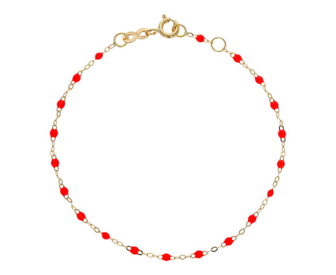 Stunning in its vibrant, warm toned color palette, this Gigi Clozeau bracelet works with your more formal and your more casual outfits. The 18K yellow gold chain is interspersed with small bright coral resin beads. It closes with an 18K yellow gold spring ring clasp closure to create a bracelet perfect alone or layered with your other favorites.