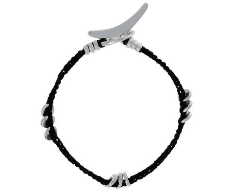 Sun, sand, saltwater, and surf - this bracelet is action ready. The three groups of three sterling silver organically shaped rings are strung on crocheted cord and can withstand even the most strenuous wear. The bracelet fastens with Jill's signature toggle clasp.