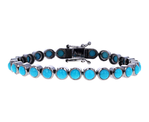 Bold, earthy, and a modern, casual answer to the more formal and traditional tennis bracelet, Nak Armstrong has created a striking, versatile alternative. From his mosaic inspired Nakard Collection, this bracelet is a continuous strand of turquoise dots. Each stone is framed in contrasting black rhodium plated sterling silver to create an individual link. It fastens with a black rhodium plated safety clasp. Perfect worn solo or nestled in with your other favorites.