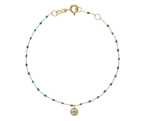 With its stylish, playful vibe, this Gigi Clozeau bracelet is perfect for the person with a cheeky sense of style. The 18K yellow gold and green resin beaded bracelet has a lacy 18K yellow gold and diamond charm set directly at its center. It closes with an 18K yellow gold spring ring clasp to create the perfect addition to your bracelet stack.