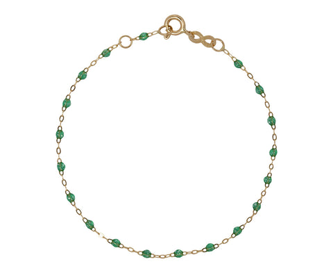 Stunning in its sparkling, cool toned color palette this Gigi Clozeau bracelet works with your more formal and your more casual outfits. The 18K yellow gold chain is interspersed with small mint green colored resin beads. It closes with an 18K yellow gold spring ring clasp closure to create a bracelet perfect alone or layered with your other favorites.