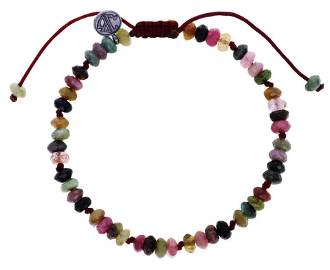Using a palette of rich, earth-toned natural tourmaline, Joseph Brooks has created a beaded bracelet with an effortless, casual style. Ranging in color from dusty pink to pale sage green, each of the faceted stones is knotted along the navy blue nylon cord. Tourmaline is a protective stone believed to shield the wearer from harmful thoughts and actions as well as bring luck and happiness unto oneself.