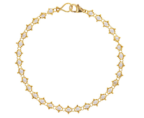 With its warm-toned color story, this Amali bracelet possesses a fluid, fabric-like luxe. Each of the white pearl beads has been meticulously hand-woven into 18K yellow gold to create the soft set bracelet. It has an air of formal elegance, but could also be paired with more casual pieces.