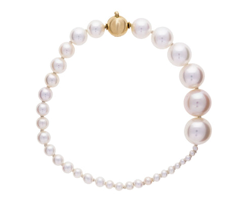 This stunning Sophie Bille Brahe bracelet is a modern interpretation of the traditional strand of pearls. The luminous white freshwater pearls dramatically taper in size to create an eye catching contrast. The hidden closure is encased in a meticulously hand made 14K gold pearl which opens to hide the mechanism. Perfect alone for its minimal elegance, it also looks amazing layered with your other favorites.