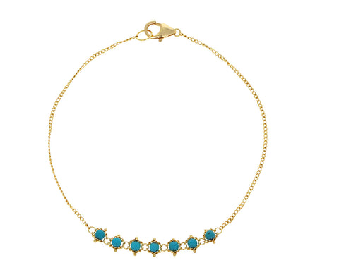 With its captivating, understated luxe, this Amali bracelet perfectly pairs 18K yellow gold and cool toned turquoise. The small, smooth turquoise beads are meticulously woven into the center portion of the 18K yellow gold chain. Alone or layered with your other favorite bracelets, it adds an effortless elegance to any collection.
