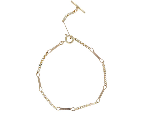 This thin whisper of a bracelet by Pascale Monvoisin exudes a quiet, sexy and understated presence. The 9K yellow gold curb chain is broken up by long, thin links adding dimension and texture. Alone or layered with your other favorites, it exudes a confident, feminine style.