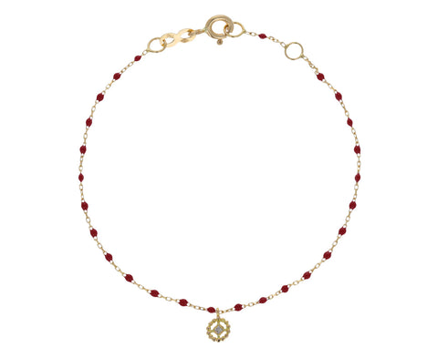 With its stylish, playful vibe, this Gigi Clozeau bracelet is perfect for the person with a cheeky sense of style. The 18K yellow gold and red resin beaded bracelet has a lacy 18K yellow gold and diamond charm set directly at its center. It closes with an 18K yellow gold spring ring clasp to create the perfect addition to your bracelet stack.