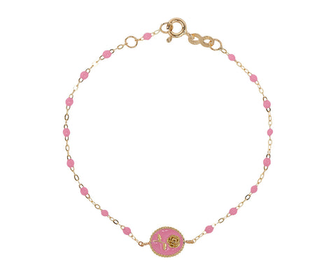 With its playful, striking design and dark color, this Gigi Clozeau bracelet also adds a hint of sparkle to your bracelet stack. The 18K yellow gold and fuschia enamel charm is set with a 18K yellow gold rose. It sits at the center of the 18K yellow gold and black resin beaded bracelet.