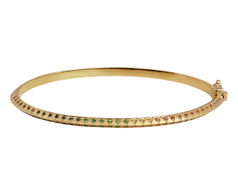 Perfect worn alone or layered with your other favorites, Harwell Godfrey has created a thinner version of her rainbow sapphire talisman bracelet. The front of the 18K yellow gold surface is set with triangles of sparkling rainbow sapphire pavé. It connects to the back with a hinge and safety clasp.