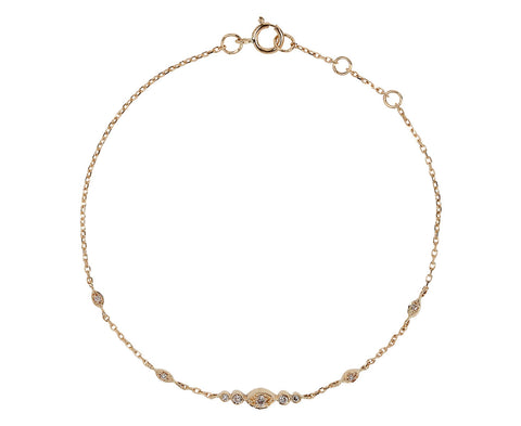Delicate and sparkling, this Celine Daoust bracelet has an earthy, style defining presence. The adjustable 14K yellow gold chain is dotted with tiny diamond evil eyes surrounding the larger center 14K yellow gold and diamond evil eye. Alone or combined with your other favorite gold bracelets, this piece exudes a stunning, quiet sophistication.