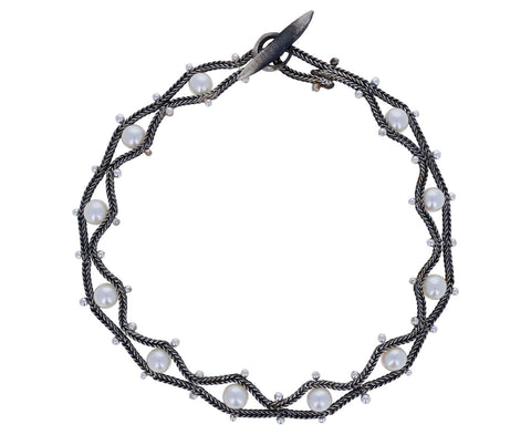 Small, luminous white pearls are framed in the center of two strands of silver foxtail chain and tiny silver studs at 1/2" intervals forming a scalloped design. A modern staple you can easily wear everyday. It measures 6 1/2" in total length and closes with a smooth silver toggle.