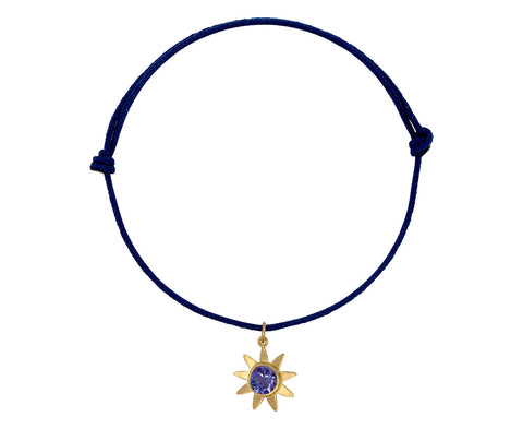 Playful and elegant, this Marie-Hélène de Taillac tanzanite sun charm bracelet lends itself to any casual jewelry collection. A deep hued round of tanzanite is set in a frame of 22K yellow gold. It dangles from the center of the self-adjusting nylon bracelet. Wear it alone or add it to your personal layered bracelet collection for a cool and contemporary splash of color.