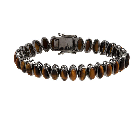 Bold, edgy with a fluid movement, this Nak Armstrong bracelet is from his Nakard Collection. Smooth ovals of subtly iridescent tigers eye are framed in contrasting settings of black rhodium plated sterling silver to create each link. The bracelet fastens with a safety clasp and looks amazing alone or nestled in with your other casual favorites.