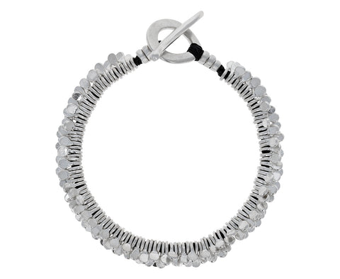 With its textural, sculptural and eye-catching style, this Jill Platner bracelet has a cool, commanding presence. Hand fabricated sterling silver beads are arranged along the length of a crocheted black cord to create a tactile row of shimmer. The bracelet fastens with Jill's signature toggle clasp closure. Style-defining and statement-making, this bracelet can be paired with anything for an effortless, eclectic look.