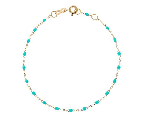 Stunning in its vibrant, cool toned color palette this Gigi Clozeau bracelet works with your more formal and your more casual outfits. The 18K yellow gold chain is interspersed with small blue-green colored resin beads. It closes with an 18K yellow gold spring ring clasp closure to create a bracelet perfect alone or layered with your other favorites.