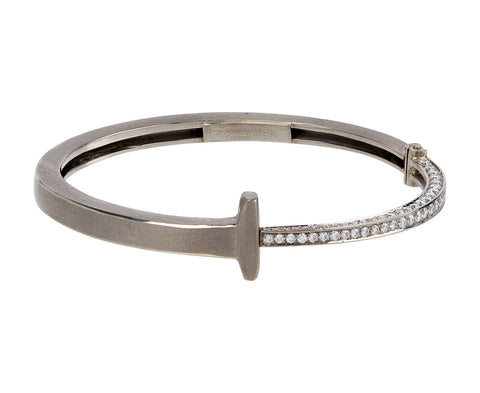 Statement-making and iconic, this Pat Flynn bracelet embodies a striking balance between edgy and sophisticated. The palladium 18K white gold nail has been carefully hand-wrought to gracefully wrap around the wrist. The arm of the hinge is perfectly set with a surface of sparkling diamond pavé which adds a captivating element to the bold look of this bracelet. The hidden opening begins at the head of the nail and hinges about a quarter of the way around. Stunning alone, but makes a dramatic addition to a stacking collection.