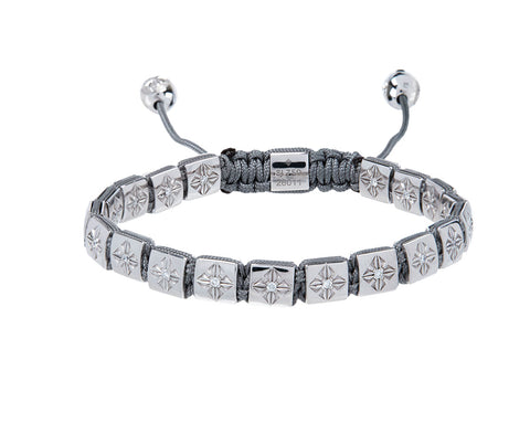 From the timeless spiritually influenced collection of Shamballa Jewels comes this stunning, signature and classic bracelet. Steeped in the spiritual and inspired by the prayer beads of many cultures, this bracelet is a series of signature 18K yellow gold beads each set with a single diamond and stamped with the Shamballa star. Tightly woven into the durable silver toned nylon cord, it can be adjusted by pulling the double round beads held by the signature square lock bead. Alone with its earthy luxury or layered with your power stack, wear this and seek your Shamballa within.