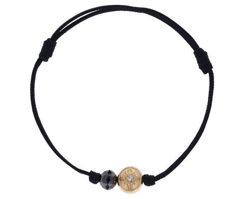 From the timeless and spiritually influenced collection of Shamballa Jewels comes this stunning, classic bracelet. The duo of beads - one faceted black diamond and one stamped 18K yellow gold and diamond - are secured at the center of the the adjustable black nylon cord. Wear this alone or layered with your other favorites.