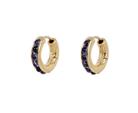 With their striking contrast of warm toned gold and cool toned color, these Brent Neale earrings are a modern take on the traditional huggie hoop. The polished 18K yellow gold hinged loops are set with a front surface of smooth, round iolite. Perfect as your casual go-to pair.
