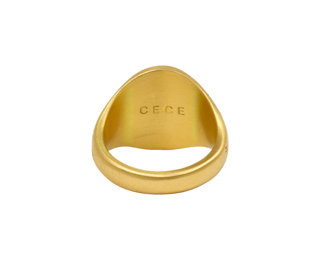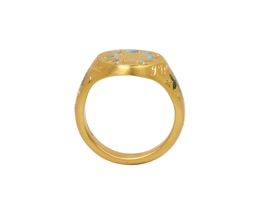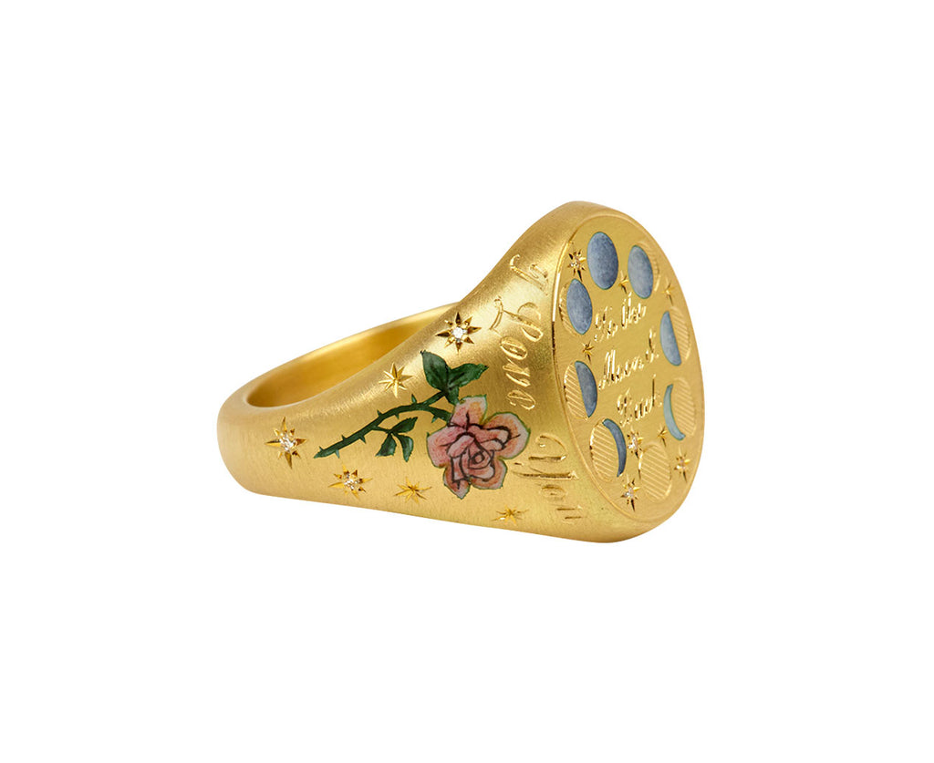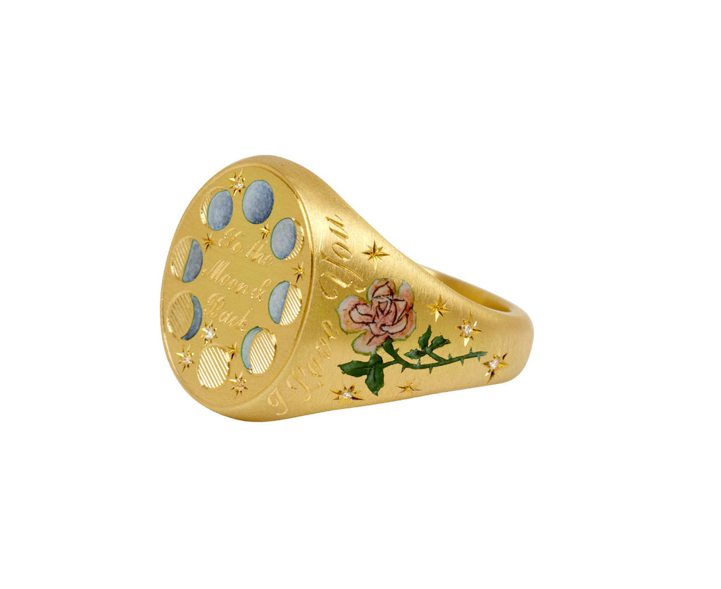 Statement-making in its bold design and stunning details, this Cece Jewelry signet ring has a celestial inspired, sweet sentiment. The large, matte 18K yellow gold oval ring face has the phases of the moon hand engraved and enameled on its front, surrounding the phrase 'to the moon and back'. Two tiny pink roses are painted on the sides, along with the words 'I Love You' along with tiny, star set round diamonds.