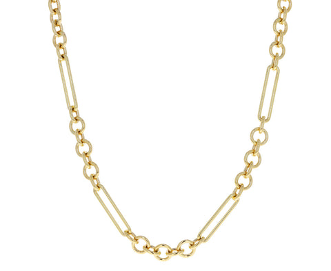 The ultimate piece of jewelry with classic versatility, this Foundrae chain is a modern must-have. The continuous strand of round 18K gold links are broken up by six long, oversized clip links. It fastens with an oversized spring ring clasp and is the perfect backdrop for any of your favorite Foundrae charms.