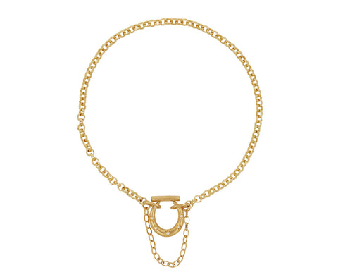Statement-making with its vintage inspired design, this Cece Jewelry bracelet is a stunning take on the traditional charm bracelet. The round, 18K yellow gold links connect to one another to create a continuous, fluid chain which surrounds the matte, 18K yellow gold and diamond horseclip. Symbolizing luck and protection, this bracelet can be worn alone or with one of her sweetheart charms.