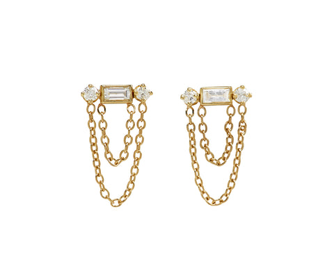 With their classic elegance and restrained sophistication, these Zoë Chicco earrings are a perfect option for every day. An emerald cut white diamond is framed by two round stones with a double chain connecting them. They are set in 14K yellow gold and attach to 14K yellow gold post backs to create an interesting alternative to traditional diamond posts.