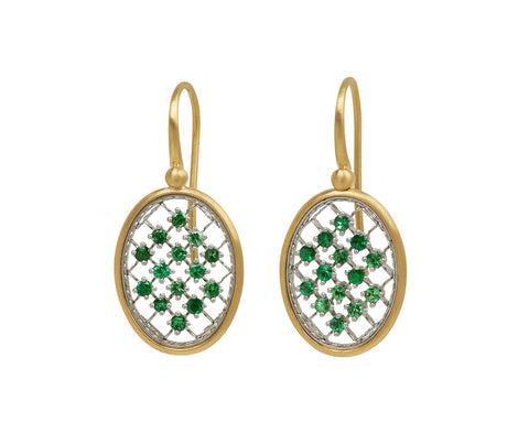 With their easy-to-wear style and understated color, these Nikolle Radi earrings have a stunning intricacy. Set in tiny platinum prongs within the woven platinum drops are round, bright green tsavorite garnets. The airy, woven design is surrounded by matte 18K yellow gold and hangs from the matching ear wires.
