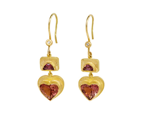 Stunning in their one-of-a-kind sparkle and sweet design, these Brooke Gregson earrings will add a luxe vibe to any collection. The double drops of faceted pink tourmaline are set in 18K yellow gold hand engraved bezels and connect with tiny 18K yellow gold rings. The larger heart shaped stone anchors the composition. The double drops hang from diamond set 18K yellow gold ear wires.