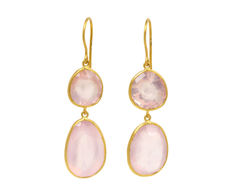 With their pale pink color and minimal design, these Pippa Small earrings are an understated, bohemian take on the traditional gem drop. Faceted drops of milky rose quartz and pale pink kunzite are framed in thin bands of 18K yellow gold to create a double stone cascade which hangs from the 18K yellow gold ear wires. Wear them casually or to dress down something more formal.
