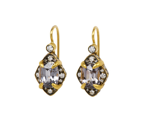 Inspired by the Goddess of love and beauty, these Cathy Waterman earrings have a subtle, warm toned color and stunning sparkle. The oval, pale gray spinel is held in oversized 22K yellow gold prongs at the center of the blackened 22K yellow gold platform setting. Round, white diamonds are set all along the setting for an intense sparkle. They close with 22K yellow gold lever backs.