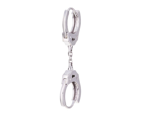 With its modern, edgy vibe, this unique 14K white gold Maria Tash earring is a tiny pair of 14K white gold handcuffs. The cuffs are functional and can be worn as a single drop or added to a double-pierced look. Add it to your one of your many piercings or even pair it with another one of her single earrings for an intentionally mismatched pair.