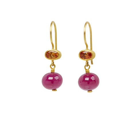 With a hint of warm toned, vibrant color and minimal design, these Mallary Marks earrings add an eye-catching style to your collection. The smooth spheres of opaque magenta ruby hang from shimmering oval pale orange sapphires which are bezel set in 22K yellow gold. The double stone composition hangs from 18K yellow gold ear wires.
