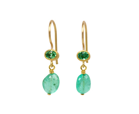 With their quiet elegance and earthy color combination, these Mallary Marks earrings are perfect for everyday. Smooth, quirky drops of bright green emerald anchor the shimmering, oval tsavorite garnet which are set in 22K yellow gold bezels. The double drop earrings hang from 18K yellow gold ear wires.