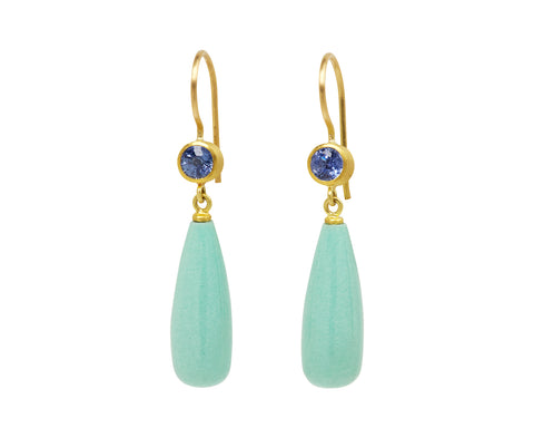 Stunning in their combination of bright, cool tones, these Mallary Marks earrings have an earthy elegance. Smooth drops of celadon varascite hang from round, blue sapphires set in 22K yellow gold bezels. The drops hang from 18K yellow gold ear wires.