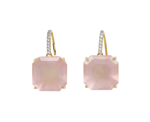 Captivating in their substantial scale and soft toned shimmer, these Mateo earrings are a striking take on the traditional drop earring. The large asscher cut drops of pink topaz are set in an open backed setting of 14K yellow gold at the center of the 14K yellow gold prongs. They hang from the 14K yellow gold and diamond pavé ear wires.