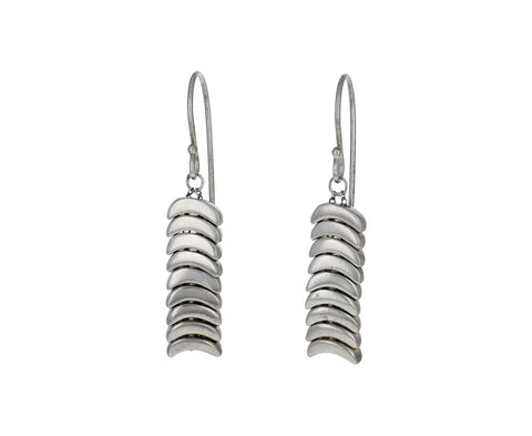 With their fluid elegance and organically imbued design, these Jill Platner earrings can be as casual or as dressy as you like. The hand fabricated sterling silver moons are stacked along a sterling silver chain to create a vertical drop of subtle shimmer. The drops hang from sterling silver ear wires to create an earthy, eclectic pair of earrings you will never want to take off!